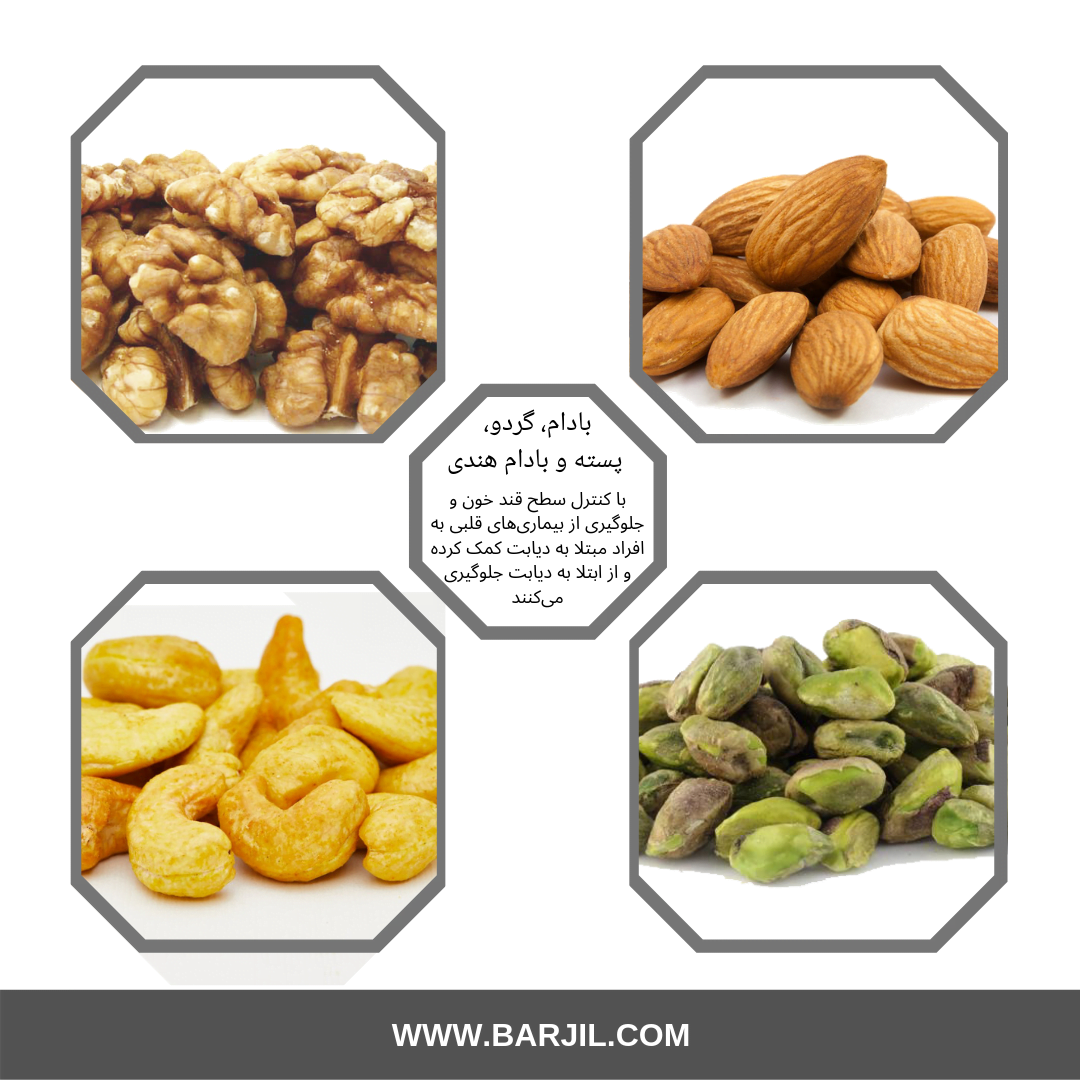 همانطور که میدانید، آجیلها و مغزهای زیادی مانند انواع آجیل مخلوط وجود دارند و بسیاری از آنها به صورت طعمدار در بازار عرضه میشوند. اما تمام این آجیلها برای دیابت مفید نیستند و بهتر است که در خوردن آنها دقت کنید. ما در این بخش 5 نوع مغزی که جزو بهترین آجیل دیابتی ها محسوب میشوند را معرفی میکنیم که میتوایند از فروشگاه اینترنتی بارجیل تهیه کنید. مفید بودن این آجیلها برای دیابت، طبق تحقیقات علمی ثابت شده است و همگی جزو رژیم غذایی مناسب دیابتی ها محسوب میشوند.