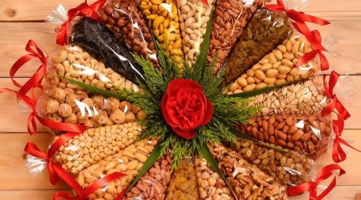 به طور کلی آجیل با تزیینهای گوناگون، گل و هدایای شیکی مانند طلا گزینه مناسبی هستند.