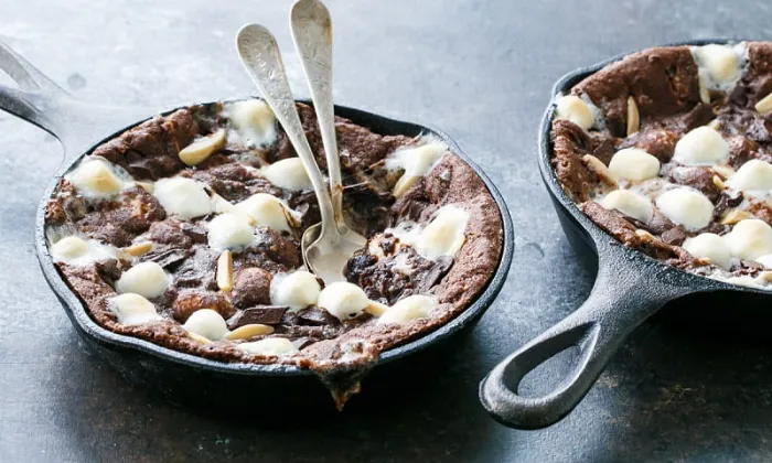 خمیر را داخل تابه بریزید و روی آن را با مقداری شکلات چیپسی، بادام و مارشمالو بپوشانید. سپس به مدت 18 تا 20 دقیقه در فر قرار دهید تا لبههای شیرینی طلایی و برشته شود. اما مرکز آن هنوز کمی نرم است.