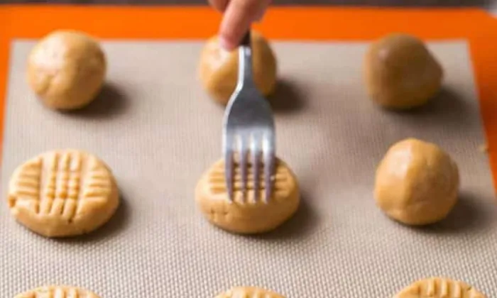 خمیر را با قاشق بردارید و به شکل گرد درآورید (30 گرم یا دو قاشق غذاخوری برای هر شیرینی). خمیر رول شده را روی سینی فر قرار دهید و بین آنها حدود 5 سانتیمتر فاصله بگذارید. با استفاده از چنگال، روی آنها به آرامی خط بکشید. آنقدر فشار ندهید که چنگال تا مرکز خمیر فرو برود.