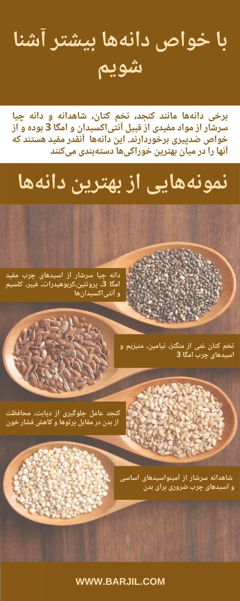 حال که با دستهبندی دانه های خوراکی آشنا شدید، برخی از دانه های مغذی را به شما معرفی میکنیم: