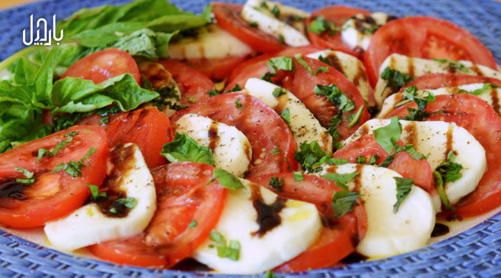 4. بر روی برشهای گوجه فرنگی و موزارلا، کمی نمک و فلفل سیاه بپاشید و روغن زیتون را هم بر روی آنها بریزید. سپس ریحانهای خرد شده را هم اضافه کنید و سس بالزامیک را روی آنها بریزید.