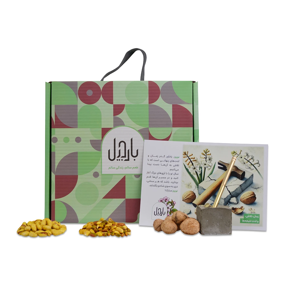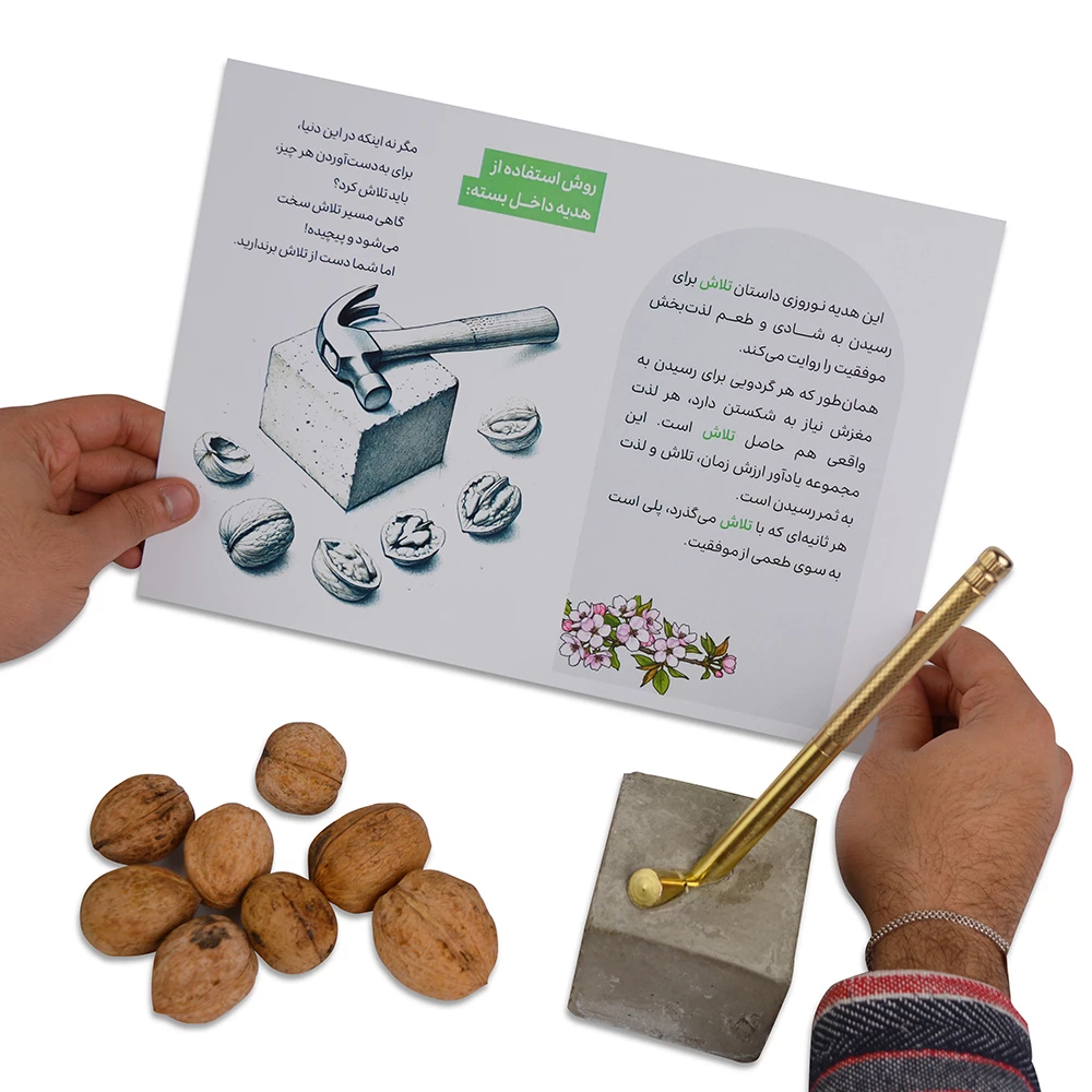 محصولات بارجیلی همچون آجیل پنجمغز و پسته احمدآقایی برشته زعفرانی اعلی، همراه با یک عنصر خلاقانه خاص، یعنی چکش و گردویی که در مکعبی بتنی قرار گرفتهاند، ارزش معنوی این هدیه سازمانی را دوچندان میکند. این آیتم نمادی از تلاش و شکستن موانع برای رسیدن به موفقیت است.