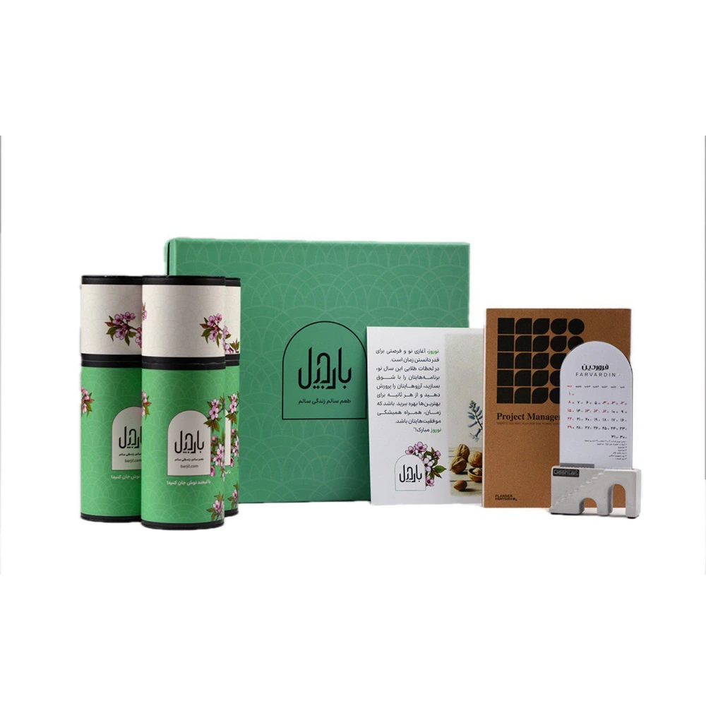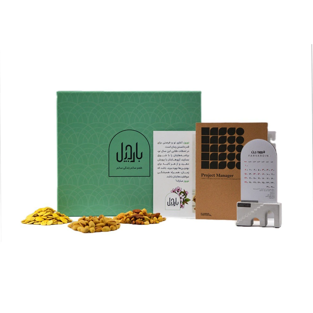 در کنار محصولات بارجیلی مانند آجیل پنجمغز، تخمه کدو مرمری برشته زعفرانی و پسته احمدآقایی برشته زعفرانی ممتاز، یک دفتر برنامهریزی کاربردی و تقویم بتنی شیک قرار دارد که نمادی از مدیریت زمان و نظم است. بستهبندی این هدیه سازمانی در یک هاردباکس مدرن و جذاب، آن را به گزینهای لوکس و درخور تبدیل کرده است.