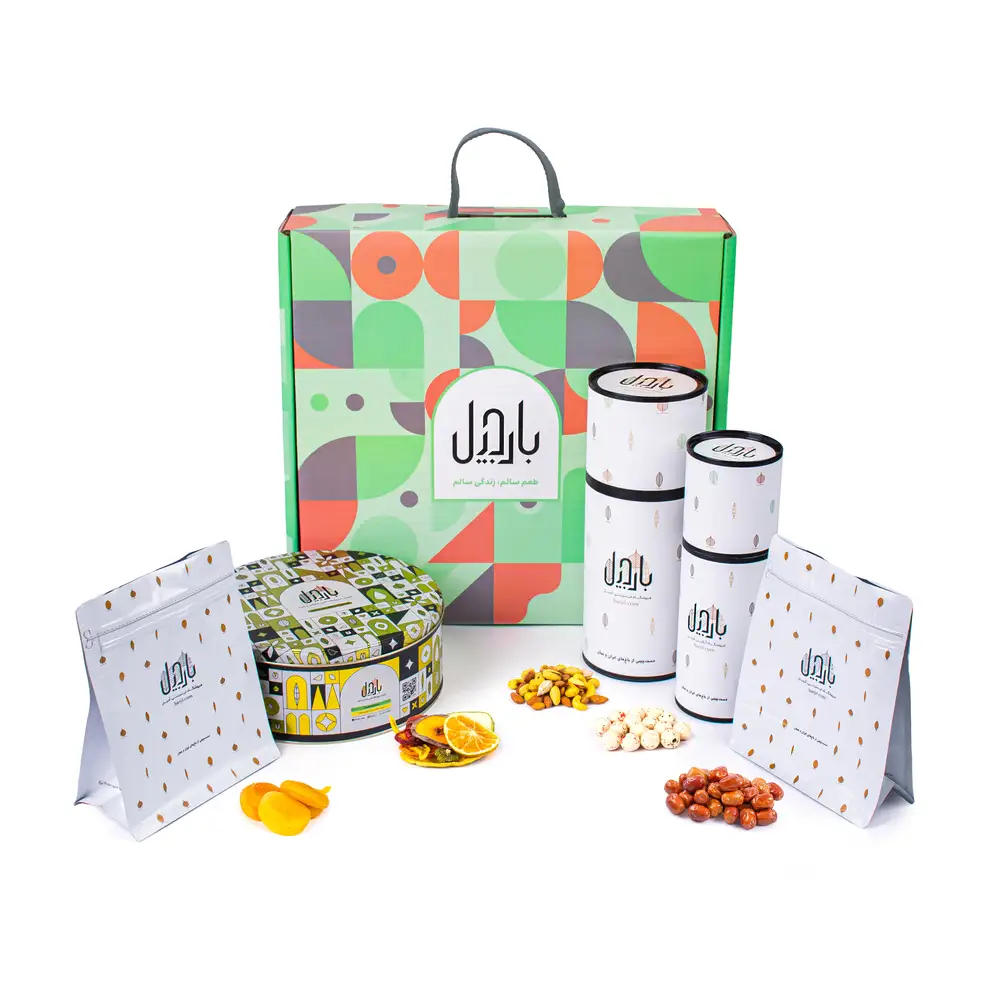 | خوراکیها | برگه قیسی ممتاز – 500 گرم دراژه با مغز فندق – 500 گرم سنجد خام – 250 گرم آجیل مخلوط چهار مغز تبریزی – 1000 گرم (محتوای آجیل مخلوط چهار مغز تبریزی: بادام هندی برشته زعفرانی ممتاز پسته اکبری برشته زعفرانی ممتاز مغز بادام برشته زعفرانی ممتاز بادام منقا ایرانی برشته با پوست) مخلوط میوه خشک – 500 گرم (محتوای مخلوط میوه خشک: انبه خشک ورقه ای خرمالو خشک ورقه ای پرتقال خشک ورقه ای توت فرنگی خشک ورقه ای هلو خشک ورقه ای سیب زرد خشک ورقه ای موز خشک ورقه ای آلو قرمز خشک ورقه ای کیوی خشک ورقه ای گلابی خشک ورقه ای سیب ترش خشک ورقه ای) |