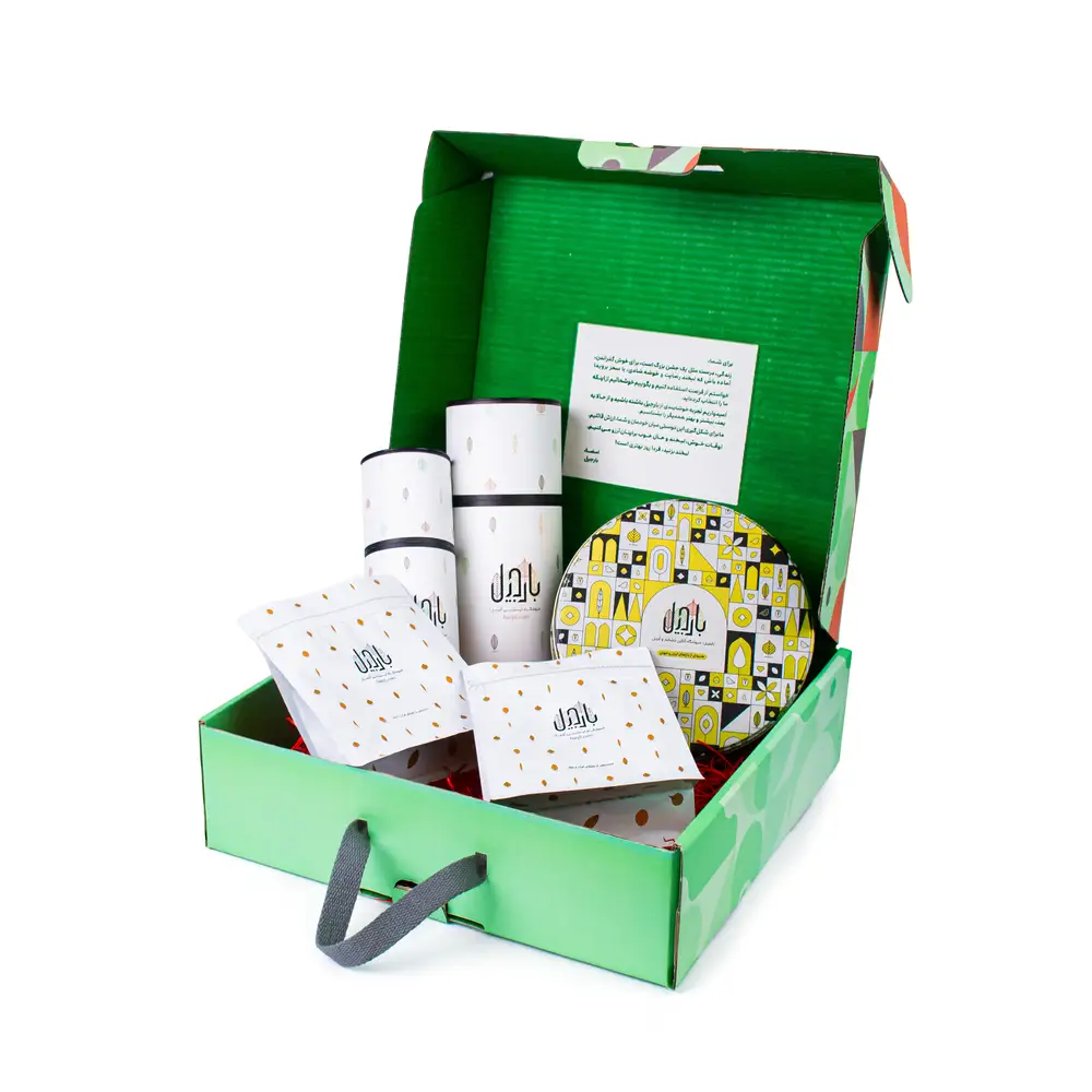 | غیرخوراکیها | قوطی مقوایی 1000 گرمی – 1 عدد قوطی فلزی 1000 گرمی – 1 عدد پاکت زیپ دار 500 گرمی – 2 عدد قوطی مقوایی 500 گرمی – 1 عدد |