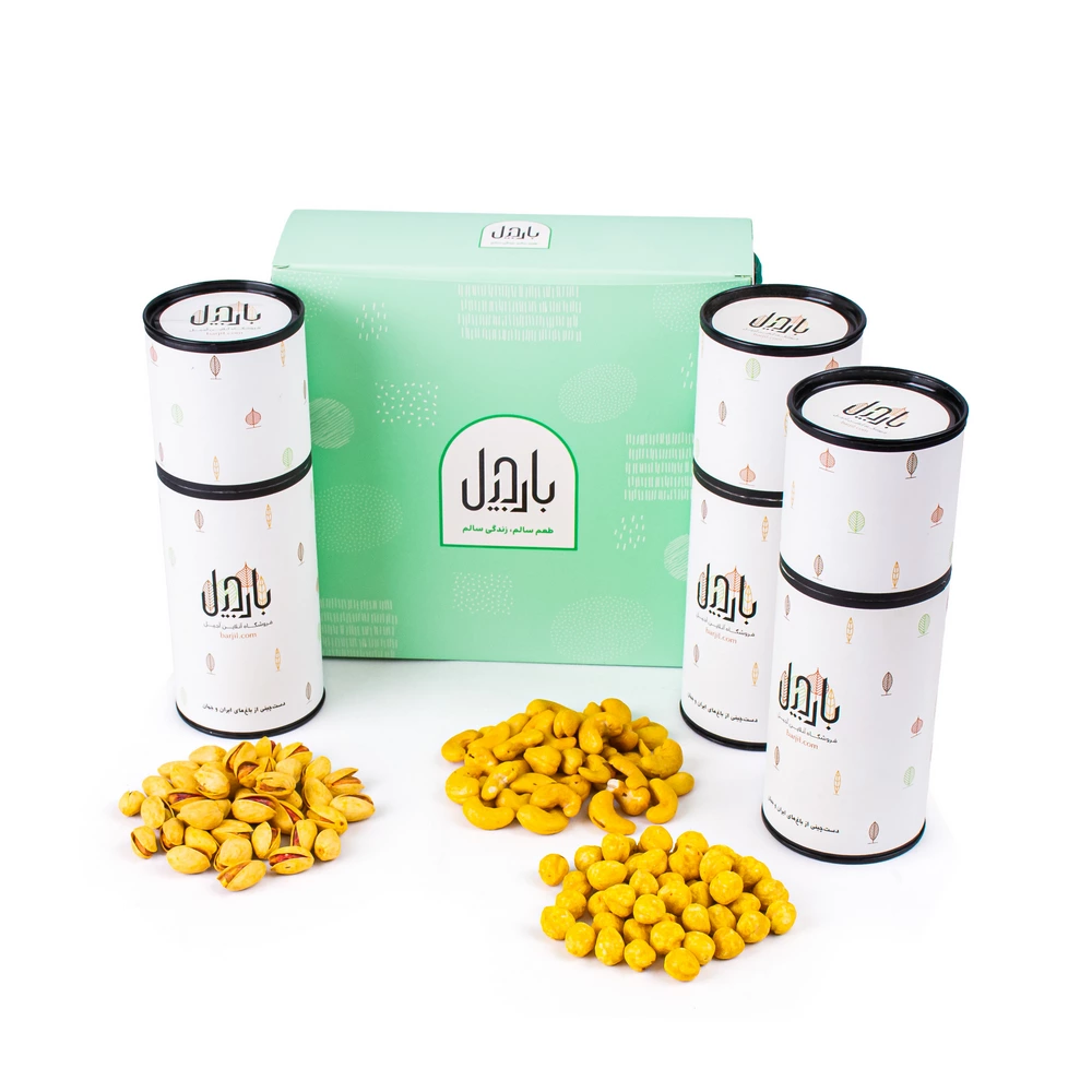 هدیه سازمانی آجیل یلدایی شامل مثلث طلایی خانواده آجیلهاست و فندق، پسته و بادام هندی سه رأس طلایی این مثلث را تشکیل میدهند: فندق برشته زعفرانی، پسته احمدآقایی برشته زعفرانی ممتاز و بادام هندی برشته زعفرانی ممتاز. شما میتوانید همین حالا با سفارش هدیه سازمانی آجیل یلدایی، زیباترین جشن یلدا را برای سازمان خود بسازید. همچنین اگر مایل به ایجاد تغییرات یا سفارشیسازی این بسته سازمانی هستید، کارشناسان ما در بخش فروش سازمانی بارجیل، آماده خدمترسانی به شما هستند. خرید این بسته که با آجیلهای درجه یک بارجیل پر شده را از دست ندهید.