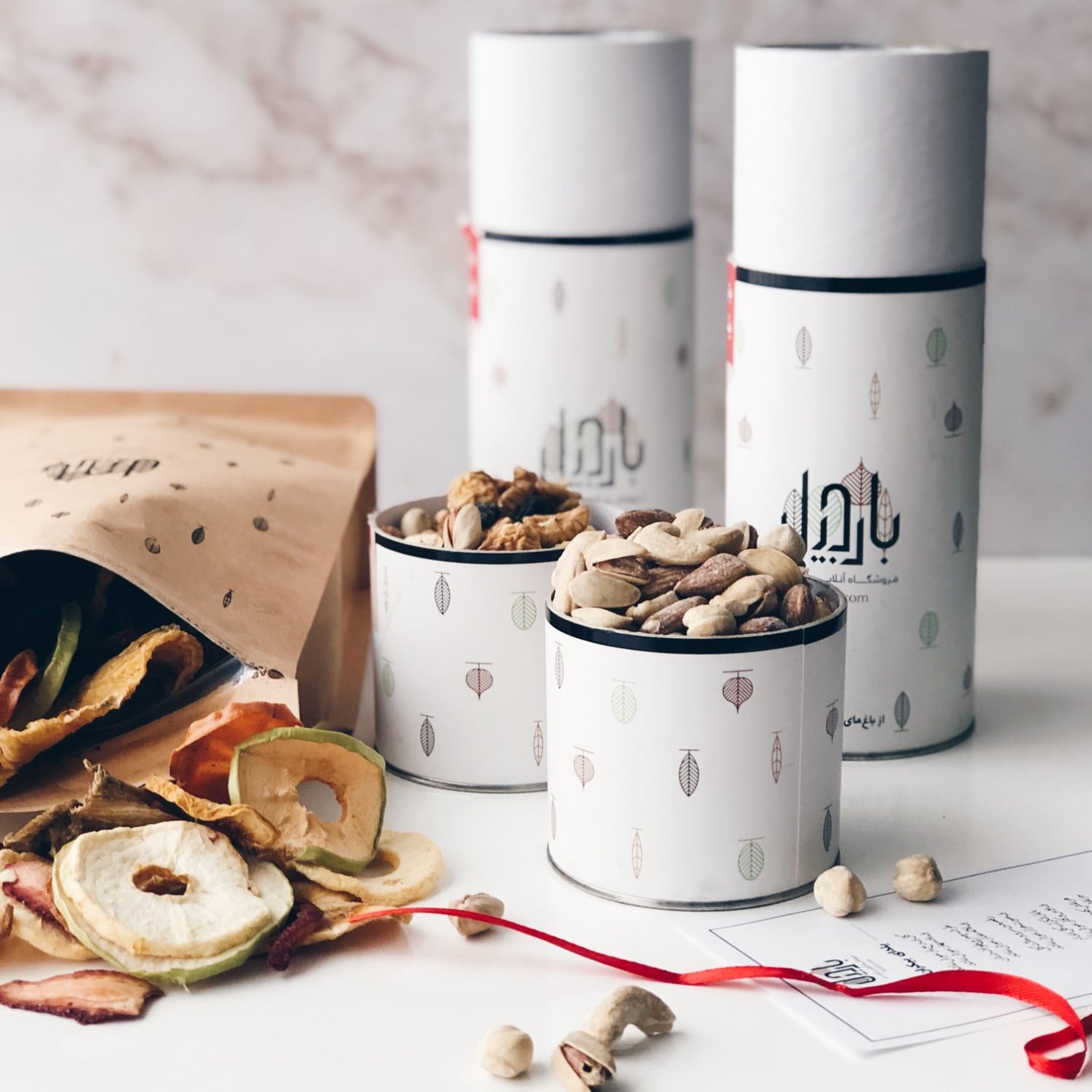 بسته یلدای کلاسیک بارجیل شامل دو قوطی ۵۰۰ گرمی آجیل مخلوط یلدا، پاکت ۵۰۰ گرمی آجیل مخلوط میوه خشک و قوطی ۵۰۰ گرمی آجیل مخلوط برشته پودری است