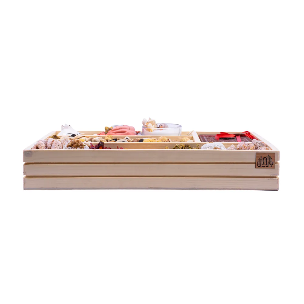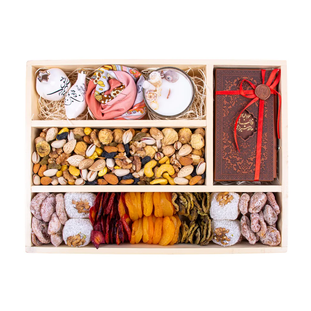 این هدیه یک جعبه چوبی شیک و خاص دارد که داخل آن با تنقلاتی همچون: آجیل یلدا، باسلوق، برگهانجیر کرمانشاهی، برگهقیسی اعلی، کیویخشک، برگهآلو قرمز و وسایلی مانند: آجیلخوریچوبیروس، شمعدریا، دیوانحافظچرم، انار و پرندهسفالی و روسری پر شده است. خالی از لطف نیست اگر بگوییم جنس روسری داخل باکس از جنس ابریشم کجراه فرانسوی باکیفیت و مرغوب درجهیک میباشد و شما را به خیابانهای پرشور و رنگ شانزلیزه خواهدبرد.