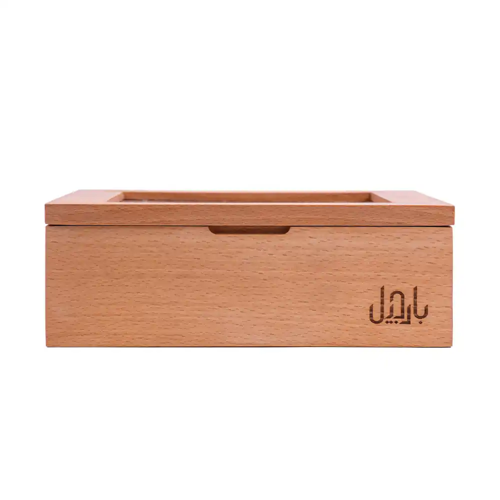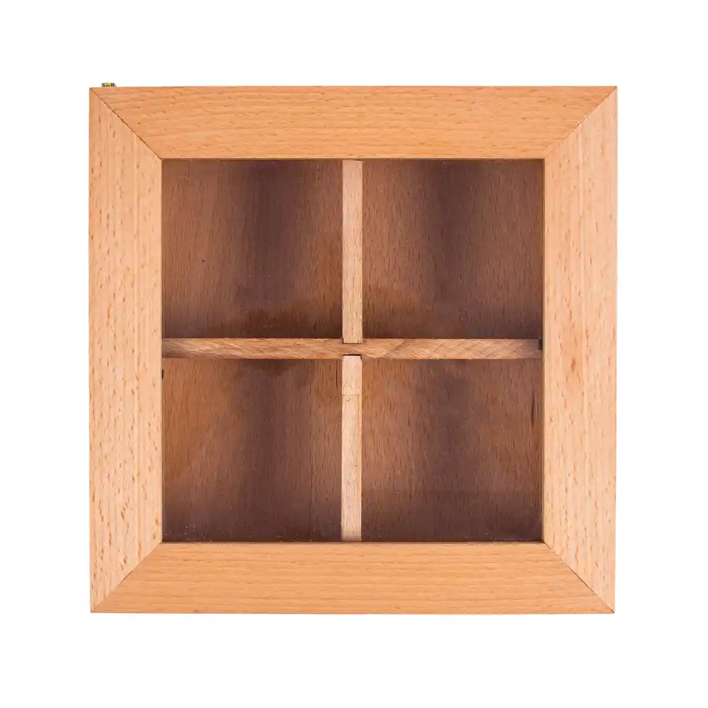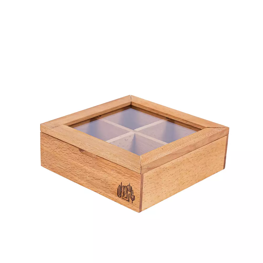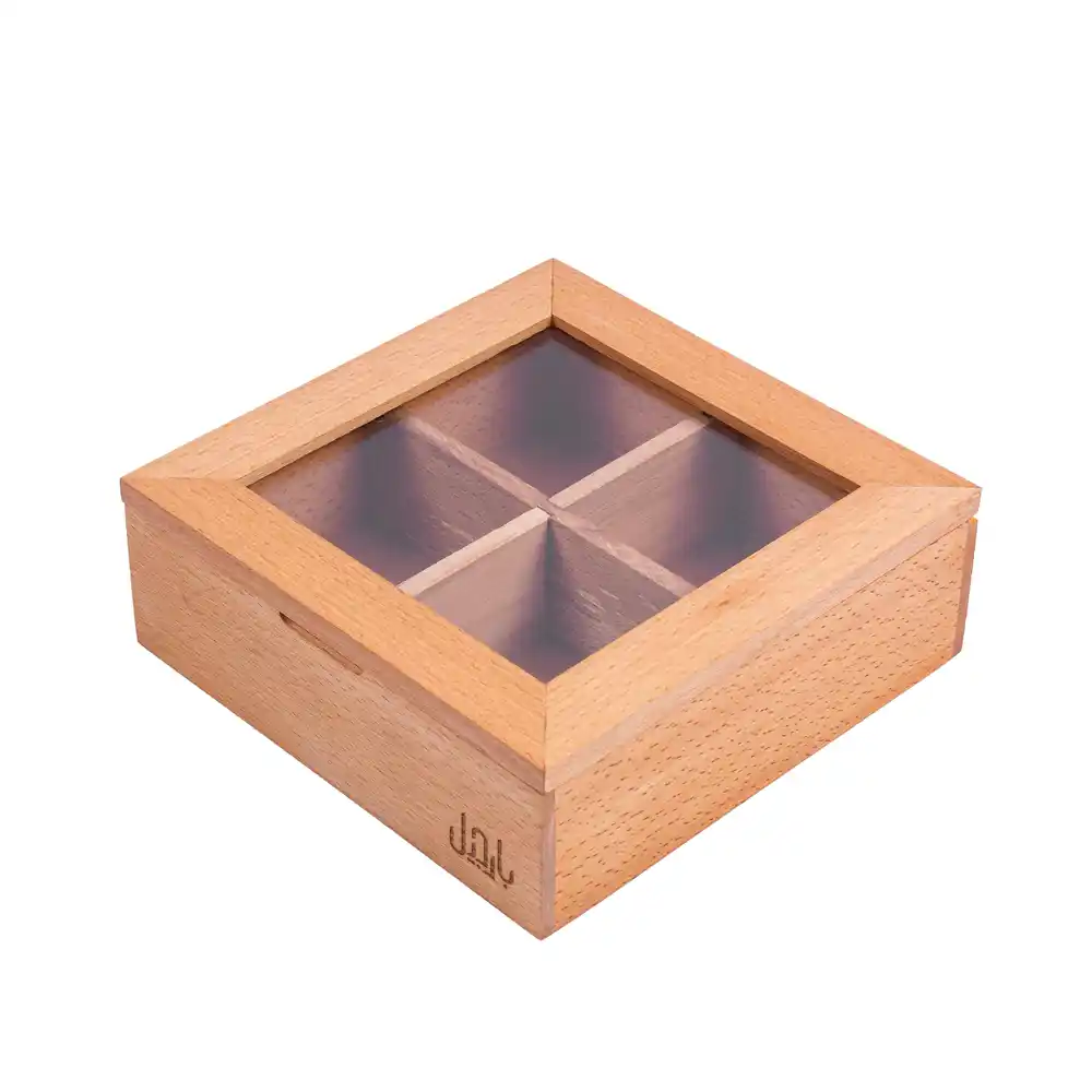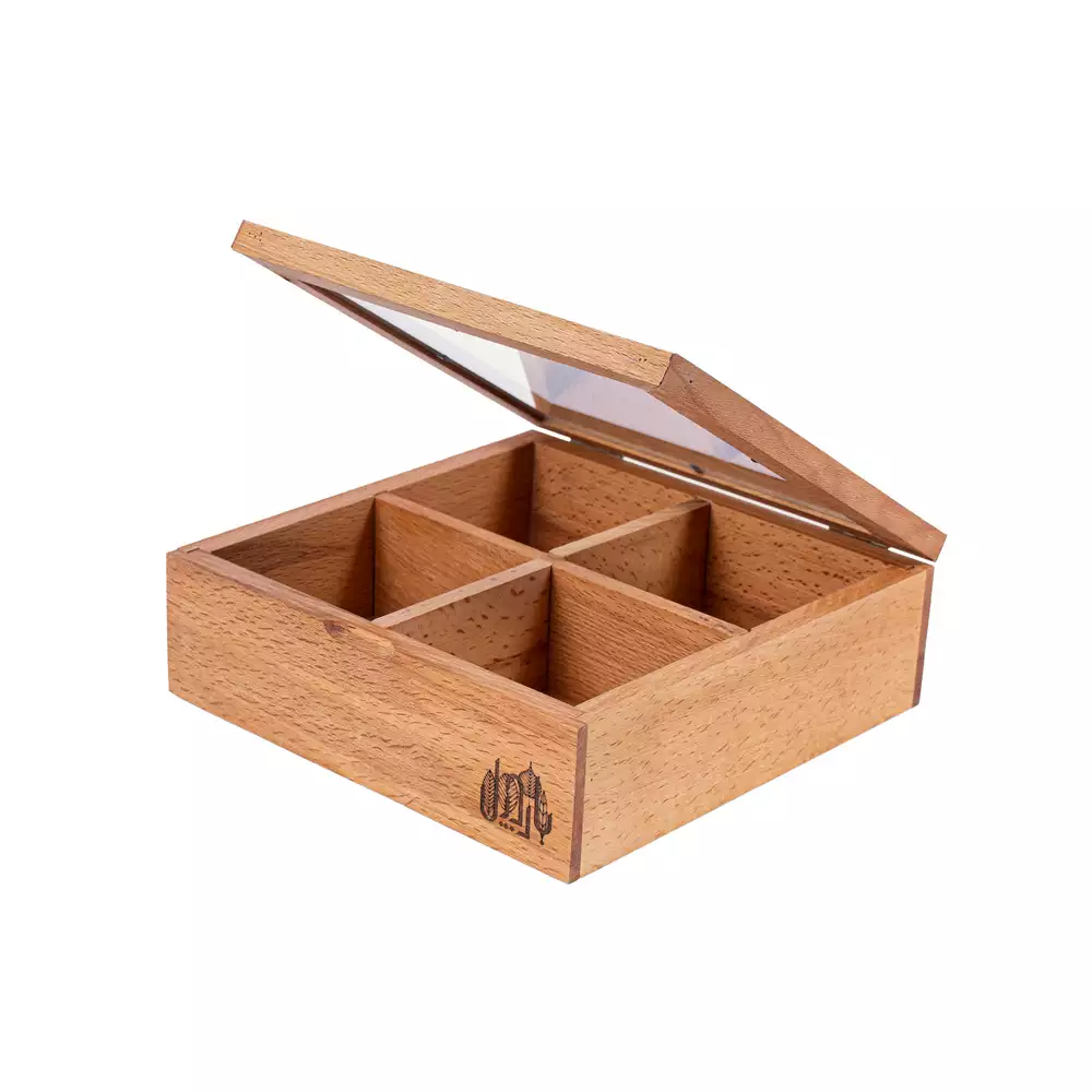 پیشنهاد ما برای این کار، جعبه پذیرایی 4 خانه است که به شما این امکان را می‌دهد تا به‌صورت همزمان دمنوش‌های مختلف را در یک ظرف 4 خانه همراه با درب قرار دهید و بهترین پذیرایی را از مهمانانتان داشته باشید. این محصول، از چوب راش گرجستانی ساخته شده است. این متریال یکی از مرغوب‌ترین انواع چوب‌ها در بازار محسوب می‌شود. همان‌طور که می‌دانید، درختان راش در مناطق مرطوب رشد می‌کنند و این چوب هم تا حدودی نسبت به رطوبت مقاوم‌سازی می‌شود. اما توصیه می‌کنیم برای افزایش طول عمر جعبه، حتما آن را در محلی به دور از رطوبت و نور مستقیم خورشید قرار دهید.