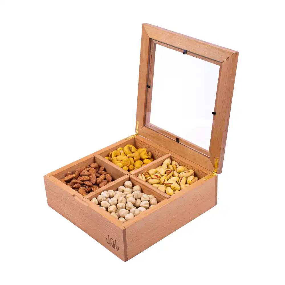 در جعبه پذیرایی 4 خانه به‌صورت شیشه‌ای طراحی شده تا خوراکی‌های داخل آن دیده شوند و بهتر بتوانید تصمیم بگیرید که کدامیک را انتخاب کنید! برای آنکه در سریع‌ترین زمان ممکن و از راحت‌ترین راه بتوانید این جعبه را خرید کنید، پیشنهاد ما خرید اینترنتی است.