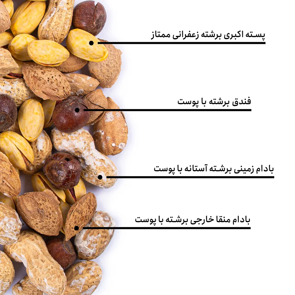 برخی آجیل و مغزها برشته و پوشیده شده از نمک، زیره، مقداری فلفل، کاری و سایر طعمدهندهها هستند. به همین خاطر، گاهی اوقات طعم اعتیادآوری دارند! البته اگر طعم اصیل خود مغزها را دوست دارید، مخلوط آجیل رویال با پوست، گزینهای مناسب است! در این مخلوط ویژه و هیجان انگیز، مغزهایی مثل بادام منقا با پوست، بادام زمینی با پوست، پسته اکبری و فندق با پوست وجود دارد.