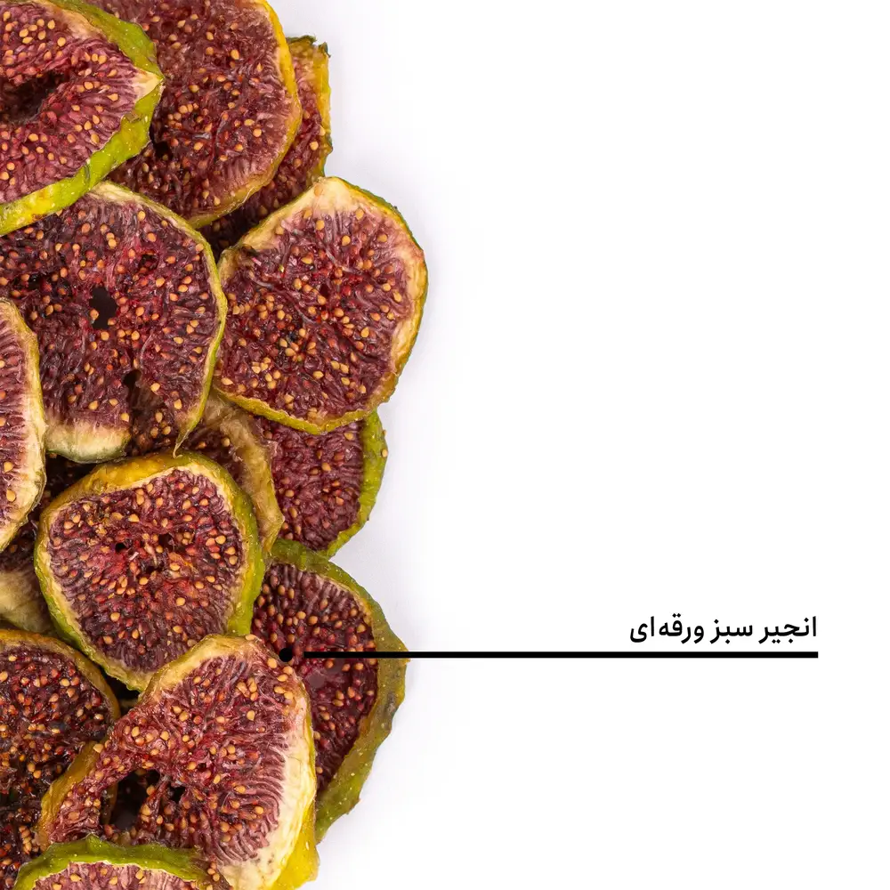 انجیر سبز یکی از میوههای آبدار و پرخاصیت است که بهصورت تازه و خشک مصرف میشود. انجیر سبز ورقهای همان انجیر سبز خشک شده است که به صورت ورقهای درآمده تا مصرف آن را راحتتر کند. این میوه خشک لذیذ، خواص متعددی دارد و به دلیل طعم شیرین، بهعنوان یک شیرینکننده طبیعی بهجای قند استفاده میشود. این میوه در انواع دسر، صبحانه با ماست، شیر و انواع گرانولا به کار میرود.